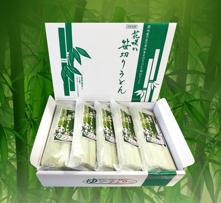 国内産の笹の葉粉末を麺に練りこんだ、ゆ~チェリーオリジナルの細打ちうどん。